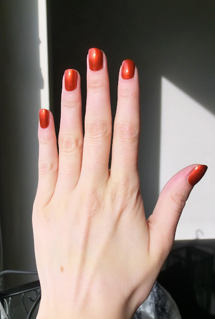 Det är ett orange skimmerlack, dock är lacket lite rödare i tonen än så här men min kamera ville inte riktigt fånga upp färgen. Bilderna gör verkligen inte lacket rättvis. Det är så vackert och så höstigt.